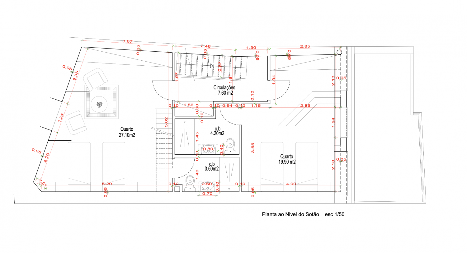 Piso 1: Zona social em plano aberto (sala e cozinha) com acesso direto a um terraço com vista desafogada e parcial de mar. Inclui uma suite completa e WC de serviço.